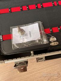 Nuova con cartellino, chiavi per la chiusura e fascia per il trasposto a spalla.