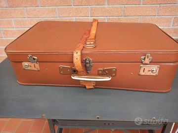valigia vintage anni '60 in materiale cartonato molto robusto, color tabacco, tasconi interni in tessuto, chiusura centrale e due laterali, con laccio in vera pelle,cm. 40 x 20 x 70, in considerazione dell' età e dell' utilizzo, lo stato è decisamente buono