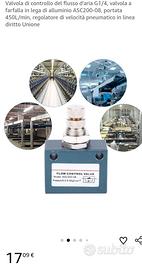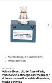 Valvola di controllo di flusso marca SNS modello ASC200-08 Regola la portata e la velocità dell'aria compressa in sistemi pneumatici,adatta per pressioni di esercizio tra 3 e 8 bar. In lega di alluminio con raccordi filettati, comunemente impiegata per controllare la velocità di attuatori pneumatici