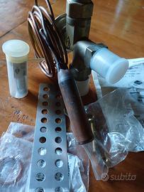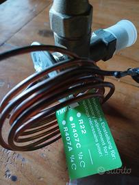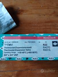 Vendo valvola di espansione termostatica Honeywell FLICA serie TMV (cod. TMV-00001), nuova e mai installata, proveniente da fondo di magazzino. Caratteristiche tecniche: Gas refrigeranti: R22, R407C, R407A. Orifizio (Düse) incluso: Taglia 0,7 (nuovo nel suo contenitore). Range di temperatura: +15 / -45 °C. Attacchi: 5/8" \times 3/4" UNF. Produzione: Made in Germany. Contenuto della confezione: Corpo valvola con tappi di protezione originali. Tubo capillare e bulbo mai srotolati (con etichetta verde originale). Bustina sigillata con staffa di fissaggio e viteria. Manuale di istruzioni originale incluso. Ideale per manutenzione e riparazione di vecchi impianti frigoriferi o celle industriali.