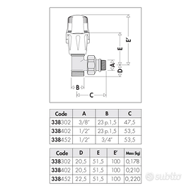 Due valvole termostatizzabili marca caleffi predisposte per comandi termostatici, elettrotermici, elettronici. Versione a squadra. Finitura: cromata. Materiale: ottone. Attacco radiatore: G 1/2" A (ISO 228-1) M. Attacco tubazione: 23 p. 1,5 Codice modello 338402 Compresi due raccordi meccanici marca Caleffi, monoblocco per tubi in rame ricotto, rame crudo, ottone, acciaio dolce e acciaio inox. Attacco: 23 p. 1,5, Attacco per raccorderia Caleffi. Diametro tubazione: Ø 10. Finitura: cromata. Codice modello 447010 Prodotti nuovi, acquistati per errore