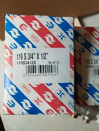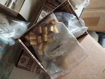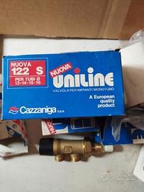 Valvole per termosifoni marca Cazzaniga per impianto monotubo. N°11 Pz.Mod.119 S 3/4”x 1/2” N°3 Pz.Mod. Nuova Uniline 122 S per tubi diam.12 a 16.N°4 confezioni di raccordi dadi e ogive.N° 1 conf. Di rosette in plastica di copertura. Prezzo cad.
