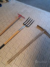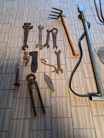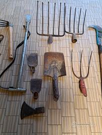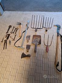 Lotto composto da: forcali, manarino, vanga, zappe accetta, paletto per tartufo, rastrelli, chiavi e tenaglie, piccone. I pezzi possono essere venduti anche separatamente