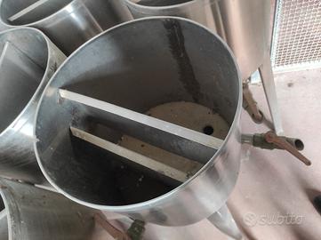 Disponibili 11 vasche in acciaio inox di capacità 35L, altezza bordo vasca 111cm, altezza rubinetto inferiore 72 cm, progettate per la raccolta dell'olio all'uscita del separatore centrifugo. Il prezzo è riferito alla singola vasca.