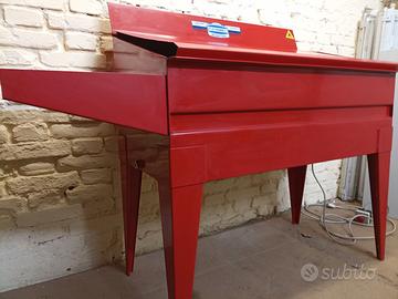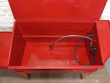 Vasca di lavaggio fissa FLEXBIMEC modello 5905 a circuito chiuso in acciaio verniciato con sistema di ricircolo del liquido mediante elettropompa a immersione, completa di tubo con doccetta, tubo con pennello permeabile a setole raschianti, che permettono un flusso continuo di liquido ed una pulizia accurata dei componenti, coperchio removibile.
