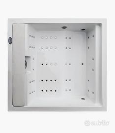 Vasca idromassaggio elegante e minimale realizzata in acrilico, rinforzata in fibra di vetro e completa di locale tecnico integrato all’interno della struttura della spa.