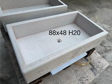 Vaschetta in pietra realizzata artigianalmente con foro centrale per lo scolo dell’acqua e pendenze. E nella parte frontale incisione artistica realizzata in Apricena bocciardato.