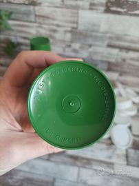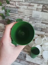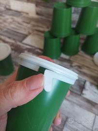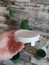 Stock vasetti/bicchieri in plastica riutilizzabili, da 200 ml (9 pezzi) forniti di tappi ermetici e sigillanti usa e getta (20 pezzi).