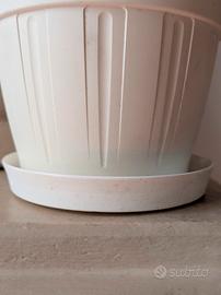 Set di tre vasi da esterno in plastica, completi di sottovasi abbinati.