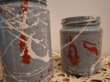 Vasi in vetro per fiori decorati a mano, verniciate di grigio con decorazioni a schizzi rossi e bianchi e rivestiti con vernice trasparente protettiva. Tre vasetti, di diverse dimensioni e forme, venduti insieme. Ottenuti da barattoli di vetro riciclati.