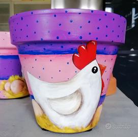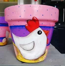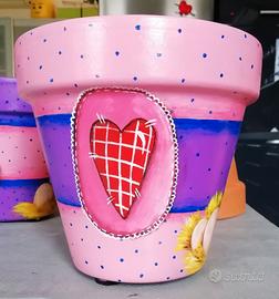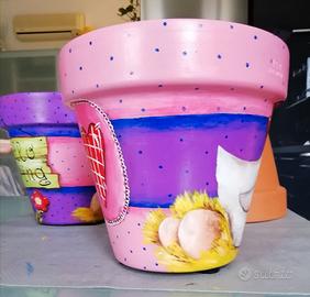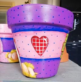 Vasi arredo in terracotta diametro esterno 19cm, dipinto a mano con feltrini sul lato inferiore, dipinto con vernice adatta alla luce solare, utilizzabile come vaso o, meglio, come coprivaso; suggerisco quest'ultimo per non rischiare di strisciarlo con le palette in occasione dei rinvasi delle piante e per non rischiarne la rottura naturalmente. Ripeto i colori non hanno nessun problema all'esterno tuttavia la terracotta se esta all'aperto e subisce ghiacciate ha una durata limitata, come qualsiasi vaso ovviamente. Bellissima idea regalo anche per Pasqua magari con una bella pianta di margherite!! Il prezzo (euro 25,00) e la spedizione indicati nell'annuncio sono per UNO solo dei due vasi (o fondo violetto o fondo rosa) per entrambi i vasi devo eventualmente modificare l'annuncio (per entrambi i vasi sconto 10% euro 45,00 + spese di spedizione).