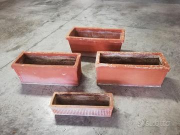 vasi in cotto d’epoca varie misure – ciotola 63x23 € 20 – due rettangolari chiari 63x29x27 € 35 ciascuno – rettangolari 63x29x27 € 20 – due 58x23x24 € 10 ciascuno - 45x13x12 € 10