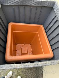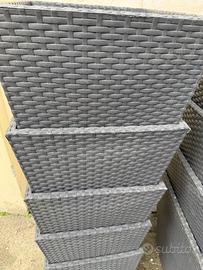 Vendesi 4 casi grandi neri intrecciati con fori per scolo nel fondo. Insieme a 5 vasi piu piccoli sempre neri di plastica robusta intrecciata. Ritiro a carico dell’acquirente. Misure piccoli: 38x38 cm h 57 cm Grandi 53x53 cm h 62,5 cm