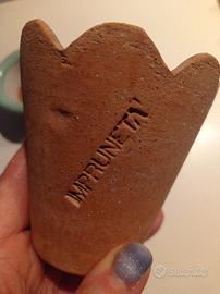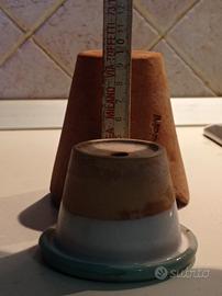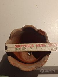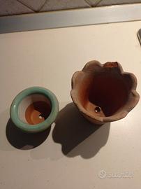Deliziosi vasetti in terracotta: quello smaltato è integro. l'altro, marchiato Impruneta (vasi fatti a mano in Italia, resistenti al gelo, molto costosi) presenta una sbeccatura di un petalo.