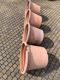 vendo nr 4 vasi per piante e fiori di materiale plastico tinta rosso mattone come foto, hanno le seguenti misure in cm: DIAMETRO esterno superiore 60, DIAMETRO BASE 41, ALTEZZA TOTALE 43 per nr 3 vasi e 45 per nr 1 vaso , evidenzio che solo nr 1 vaso ha il BORDO con un pezzo mancante come foto e 1 altro vaso presenta una leggera crepa sul fondo creatasi con lo svuotamento ma che non ha alcuna problematica di contenimento ma per il resto ovvero la struttura di tutti i vasi è molto buona, la capacità di ciascun vaso è di circa 80 litri di terriccio, vendo in blocco i 4 vasi con ritiro diretto previo accordi, in caso di richiesta di singoli vasi contattatemi per accordi grazie, è possibile anche la spedizione che devo gestire io per le dimensioni del pacco cm 55 x 62 x 62 peso 9 kg e che quantifico in modo preciso appena mi viene comunicato il CAP di destinazione.