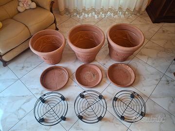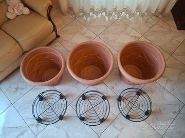 Vendo solo in blocco 3 vasi in resina completi di vaso, sotto vaso, carrello porta vaso. Misure: 2 vasi sono diametro 55, e 1 vaso diametro 50.