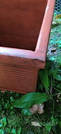 Coppia vasi terracotta da esterno. Forma quadrata cm. 36x36x36. Di vecchia fattura robusti e pesanti. Su angoli alcune sbeccature.