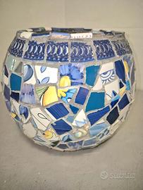 Vaso artigianale decorato con la tecnica del mosaico, realizzato utilizzando pezzi di ceramica o piastrelle, caratteristico per esterni, decorazione da giardino.