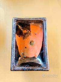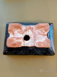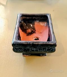 Vendo questo splendido piccolo vaso da bonsai (dimensione mame o shito), un pezzo vintage con almeno 20 anni di storia. Caratteristiche Principali: Colore: Un profondo e affascinante blu scuro (quasi nero) con una smaltatura puntinata che imita la texture della pietra. Molto decorativo. Forma: Rettangolare classica con angoli smussati e piedini a fascia ben proporzionati. Materiale: Ceramica in pasta rossa (visibile sul fondo e all'interno). Dettagli Tecnici: Dotato di foro di drenaggio centrale, essenziale per la salute delle radici. Condizioni: Ottime condizioni vintage, senza crepe o scheggiature evidenti. Lo smalto esterno è integro e lucente. All'interno si notano le naturali irregolarità della colata di smalto, tipiche di questa lavorazione. Perfetto per: Piccolissimi bonsai "mame" o "shito". Piantine grasse e succulente (come piccole Echeveria o Sempervivum). Collezionisti di vasi da bonsai vintage. Un oggetto unico che unisce estetica orientale e fascino vintage.