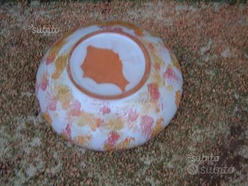 Vaso da fiori in terracotta a forma di ciotola basso e ampio, molto rastremato. Dipinto con colore bianco di sfondo e inserti rossi. Bordo di colore rosso mattone. Diametro apertura 25 cm. Euro 10,00.