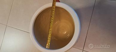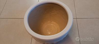 Vendesi vaso da piante in ceramica smaltata a forma di sfera e con apertura rotonda. Colore bianco con decoro marrone e diametro totale di 24 cm.