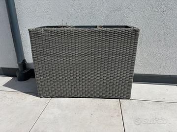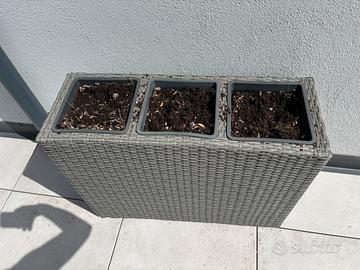 Fioriera grigia in polyrattan con una robusta struttura in acciaio. La fioriera ha 3 scomparti, che ti offrono la possibilità di piantare tre piante o fiori simili o diversi. È possibile fare facilmente un foro di drenaggio per garantire lo scarico dell'acqua in eccesso. La fioriera può essere utilizzata anche come divisorio per ambienti.