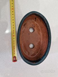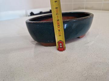 Vaso Giapponese Smaltato verde-blu Per Bonsai 20cm ovale. Il vaso è usato e presenta leggere tracce di terra e calcare.