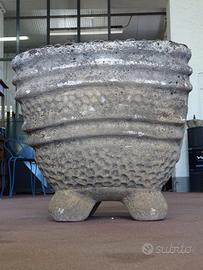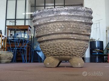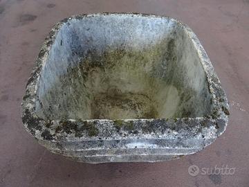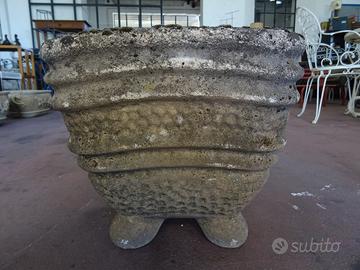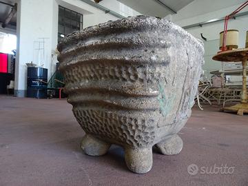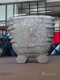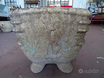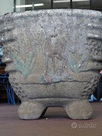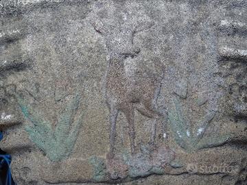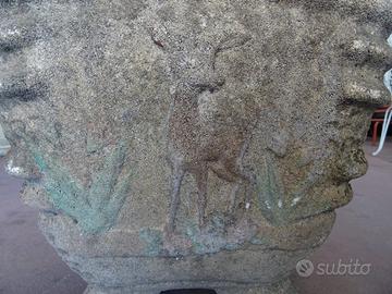 Vecchio vaso in cemento con disegno su una facciata raffigurante cerbiatto.