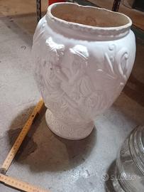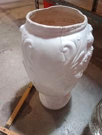 Bellissimo vaso in ceramica bianca con dettagli in rilievo e un inserto in vetro trasparente.