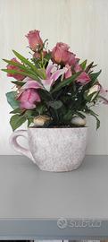 Una bellissima tazza col manico con stampata una rosa. Ho messo dei fiori finti (volendo si potrebbe valutare la vendita anche di quelli)