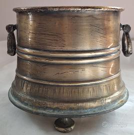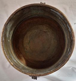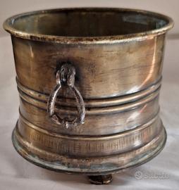 Vaso in rame o forse ottone. La forma è come quella di un secchiello porta ghiaccio o di un braciere. Il suo ultimo utilizzo negli ultimi anni è stato come Vaso porta piante in appartamento. Direi molto ben tenuto. È alto cm 21, ha una bocca con diametro cm 23 e una base più larga di cm 25.