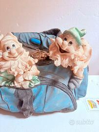Vendo vaso con due nani da giardino in resina applicati su uno zainetto blu. Un oggetto particolare e decorativo, ideale per piante e fiori. Disponibile la spedizione o ritiro di persona. Dimensioni: 30x20x25 cm