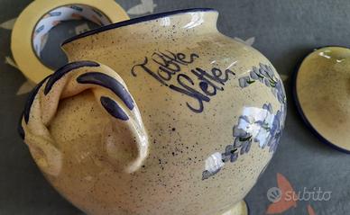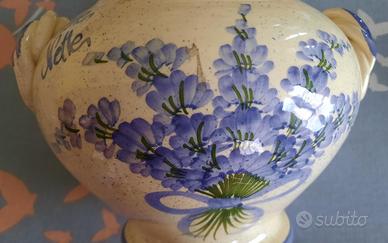 Vendo vaso provenzale in ceramica, con manici e coperchio, decorato con un motivo floreale e marcato.