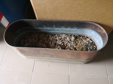 Vaso vasca in rame e base ottone antico lunghezza 70x profondità 25cm, come in foto, molto bello, massiccio, comprensivo di contenuto base dove appoggiare il terreno o per metterci anche le piante finte o anche i pesci, con aggiunta di rotelle per spostarlo facilmente.