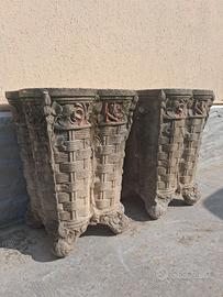 Coppia di vasi in cemento stile Liberty con decorazioni ad intreccio a simulare un cesto in vimini e nella parte superiore bordatura in tralci di rose che in origine erano di colore rosso porpora. Sono allo stato originale e sono perfetti. Sempre usati sotto un porticato. Risalgono all’inizio degli anni ‘70 del secolo scorso. Non più in produzione di questa qualità e manifattura. Misurano in altezza 63 cm con i lati superiori di 47 cm per un peso di 52 kg cadauno. Euro 160 per entrambi.