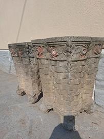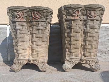 Coppia di vasi in cemento stile Liberty con decorazioni ad intreccio a simulare un cesto in vimini e nella parte superiore bordatura in tralci di rose che in origine erano di colore rosso porpora. Sono allo stato originale e sono perfetti. Sempre usati sotto un porticato. Risalgono all’inizio degli anni ‘70 del secolo scorso. Non più in produzione di questa qualità e manifattura. Misurano in altezza 63 cm con i lati superiori di 47 cm per un peso di 52 kg cadauno. Euro 160 per entrambi.
