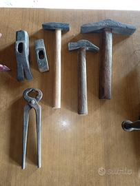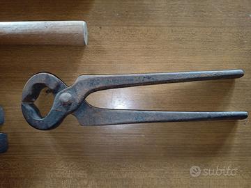 due strumenti per viti a passo lungo martelli una vecchia pinza a tenaglia per il ferro e uno stampo a pressione per decori