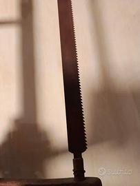 Come da foto vendesi vecchia sega da falegname risalente agli anni 40/50. Completa di lama dentata e corda e asse tendilama, è uno splendido oggetto di antichi mestieri. Misura 65X34