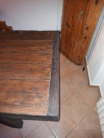 in vendita vecchio banco da falegname riadattato a tavolone. Le gambe non sono originali. Necessità restauro, misure 93×268(più morsa) H80. Solo ritiro, visto il peso ~200kg e le dimensioni