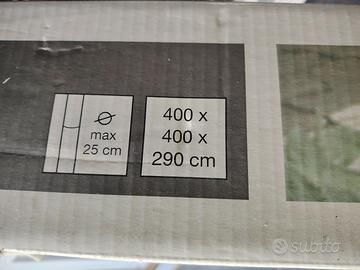 Tenda da sole "a vela" per campeggio, spiaggia e giardino, si monta molto facilmente su due pali telescopici e quattro tiranti. Quadrata, misura 4x4 mt, in tessuto sintetico rivestito, colore bianco. Produce una protezione dal sole molto efficace. Leggera e facilmente trasportabile, si monta e smonta in pochissimi minuti. Completa di pali, tiranti e picchetti.