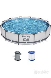 Vendi piscina tonda cm366x76, usata una stagione, con pompa a cartuccia piu tubi e tutti i componenti (no skimmer). La piscina attualmente e ancora piena se si volesse venire a vederla per essere sicuri che non sia bucata. Possibilita di aggiungere telo per coprirla