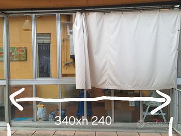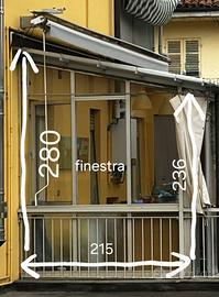 Veranda in alluminio con doppi vetri, quelli a terra non trasparenti per privacy. 5 moduli. Due laterali come da foto di cui uno con vetri e finestra, uno solo struttura con plastica. Due ante frontali da 3 metri e 40 altezza 2 metri e 40. Anta aggiuntiva 110x240h. Possono essere montate affiancate o sfalsate x scorrere. Una parte con porta e serratura. L'altra con doppia finestra