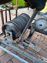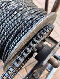 Vendo verricello con 250 metri di cavo in acciaio diametro 5 mm avvolto su bobina con asse rotante su cuscinetti, completo di corona, pignone e catena per poterlo motorizzare con motore elettrico o a scoppio. Struttura molto resistente con forcella per direzionare il cavo in fase di avvolgimento e freno per bloccare lo srotolamento in discesa
