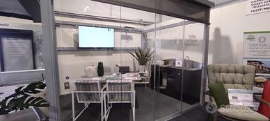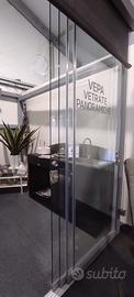 Vendiamo per rinnovo esposizione, vetrata panoramica scorrevole misure mm. 3600XH2400 modello Slide Glass di Pratic, 4 ante, 4 vie con chiusura a dx e sx, impacchettabile da entrambe i lati. Prodotto che può essere installato in edilizia libera, utile alla chiusura di porticati, pergole, terrazzi o balconi. Profilo a terra e profilo superiore colore grigio RAL 9006. Prodotto di esposizione interna, in perfette condizioni. Prezzo indicato al netto di IVA, escluse consegna e montaggio. (listino euro 4200)