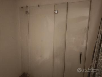 box doccia design (3 ante)due ante anteriori come da foto e anta laterale come da misure in foto. completa di tutto il kit di montaggio e guarnizioni. smontata dal mio nuovo bagno per acquisto piatto doccia fuori misura. altezza ante 190 larghezza 2 da 85 e la piccola da 25. praticamente nuove. valore mille euro vendo a prezzo irrisorio per inutilizzo. ritiro Roma fermata metro Anagnina.