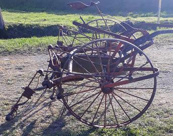 Vendo voltafieno a forche Laverda tipo VF 6 C larghezza di lavoro 2,10 m. Costituito da un telaio di acciaio appoggiato su due ruote di grande diametro, sul quale sono montati gli organi di attacco per il traino animale o meccanico. Un secondo telaio porta gli organi di lavoro unitamente a quelli di trasmissione. Gli organi di lavoro sono costituiti da 6 forche a denti elastici collegati, a metà lunghezza del loro manico, a un albero a gomiti. La capacità di lavoro si aggira sui 4000 mq/h. Le forche si abbassano sul terreno e poi si sollevano, lanciando il foraggio all'indietro e poi verso l'alto.