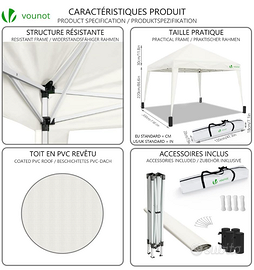CONTENUTO DELLA CONFEZIONE - 1 gazebo pieghevole, 4 sacchi di sabbia, 8 pioli, 4 corde, 1 borsa per il trasporto e 1 manuale di istruzioni. NOTA BENE: questo gazebo pop up non è destinato all'uso incustodito o in condizioni meteorologiche avverse.