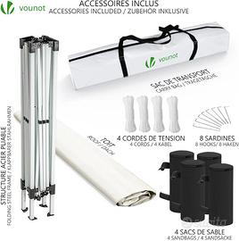 CONTENUTO DELLA CONFEZIONE - 1 gazebo pieghevole, 4 sacchi di sabbia, 8 pioli, 4 corde, 1 borsa per il trasporto e 1 manuale di istruzioni. NOTA BENE: questo gazebo pop up non è destinato all'uso incustodito o in condizioni meteorologiche avverse.