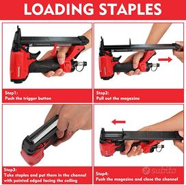 【Contenuto della confezione】1 X pistola sparachiodi ad aria compressa, 500 X graffette 6mm, 500 X graffette 10mm, 500 X graffette 16mm, 1 X boccetta d’olio (con olio), 1 X chiavi a brugola, 1 X manuale dell'utente. Comune utilizzato per la produzione industriale, decorazione di elettricisti, produzione di mobili, tappezzeria, lavorazione del legno, costruzione di mostre e così via