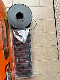 Accessori di serie compresi: filo perimetrale completo, picchetti ferma filo, connettori di raccordo, lame di ricambio, batteria al litio, base ricarica, libretti di uso e manutenzione.
